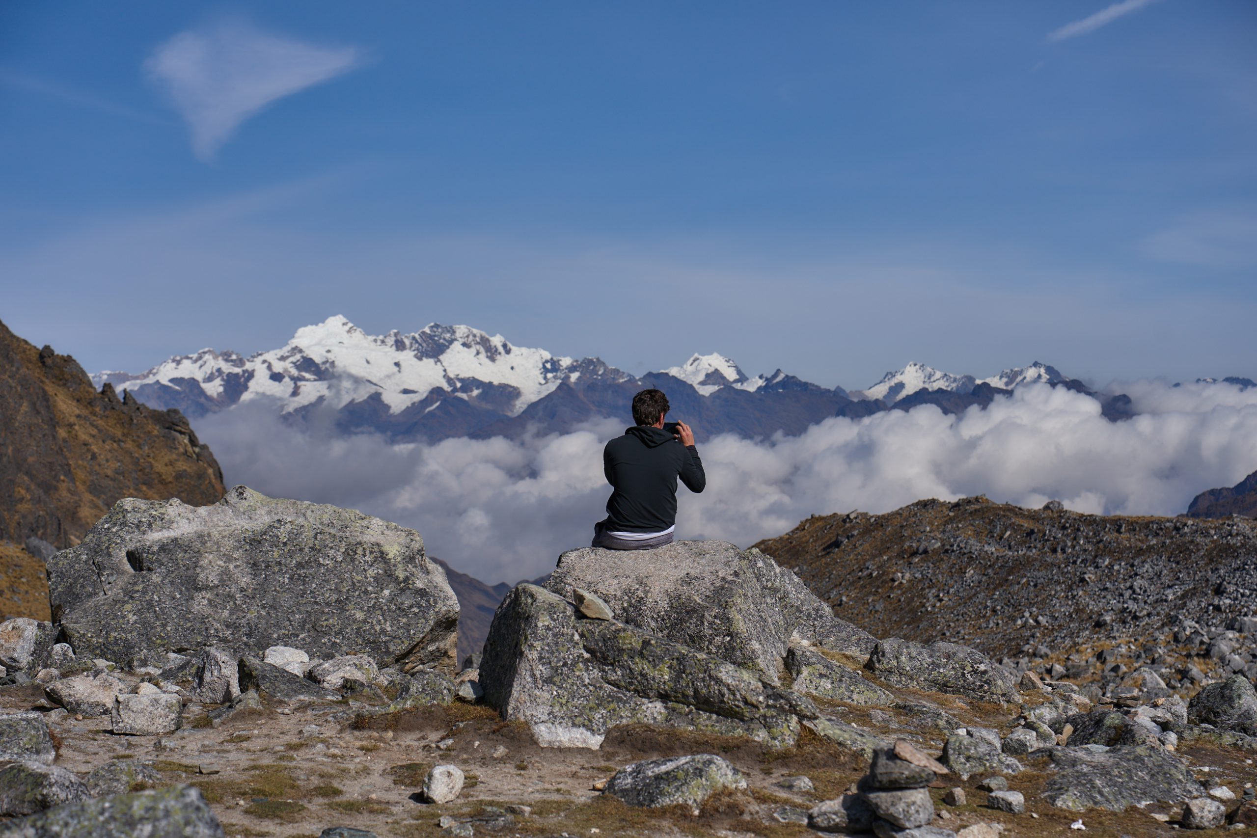 We ascend for approximately one hour to the highest point of the route, Apacheta Pass (4,650 m / 15,255 ft). From the summit, take in spectacular 360° panoramic views of the Salkantay, Humantay, and Huayanay peaks, surrounded by glacial lakes and pristine valleys—an unforgettable highlight of the Salkantay Trek.